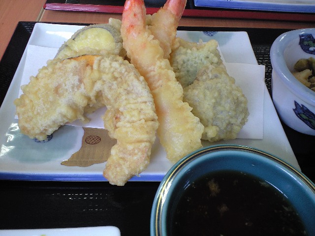 海老2本、かぼしゃ、椎茸、茄子、エリンギ、舞茸。