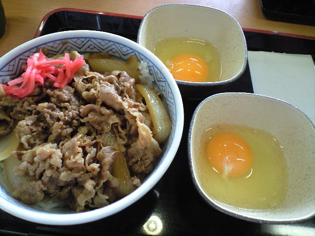 カウンターに座り、「牛丼、並盛り、生卵1つ」と注文した。