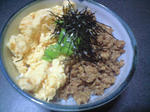 後は丼にご飯を半分盛って、挽肉と炒り卵を半々に乗せる。