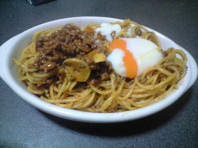 挽肉にトマトソースにすぱげっちーなのに、何故か温玉が合う。