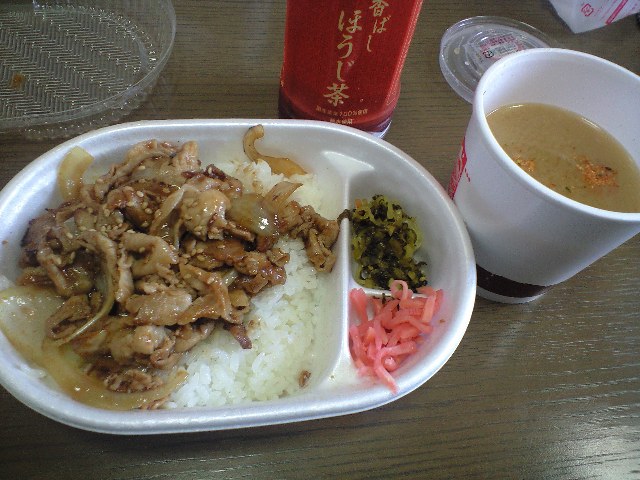 多くの場合、しょうが焼き弁当と、豚汁とほうじ茶をセットで買う。