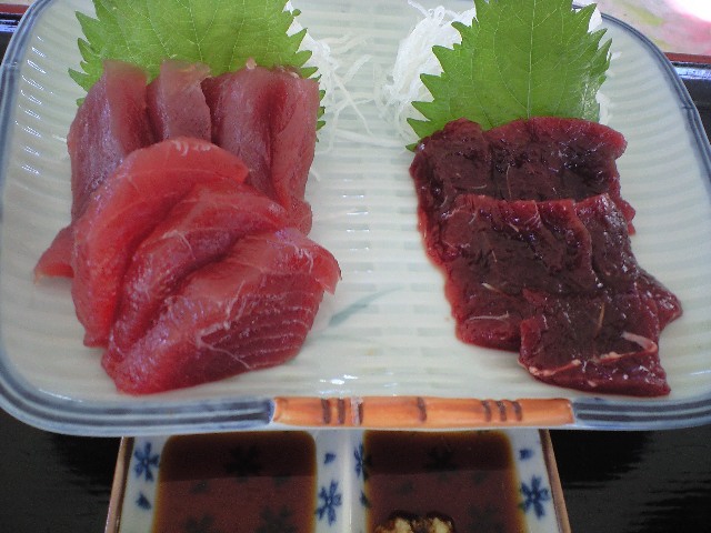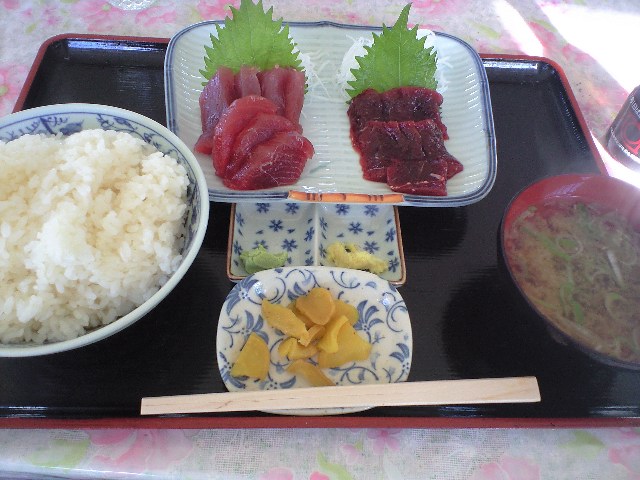 ご飯(大盛り)、味噌汁(とろろ昆布)、お刺身(マグロの赤身、鯨)、たくあん。
