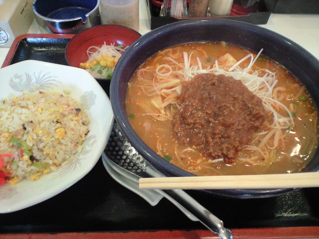 カウンターの端に座って「坦々麺、半炒飯」を注文する。