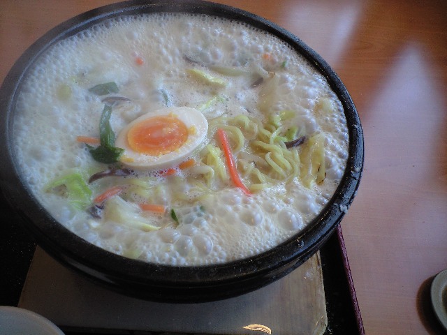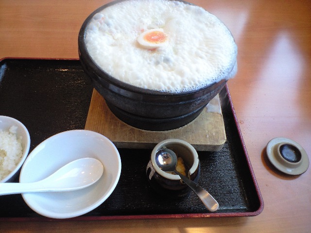 目の前で、熱した石鍋に「とんこつスープ」を注いでくれる。