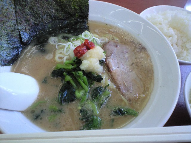 七味と紅生姜を乗せて、わっしわっしと半分掻き込む。