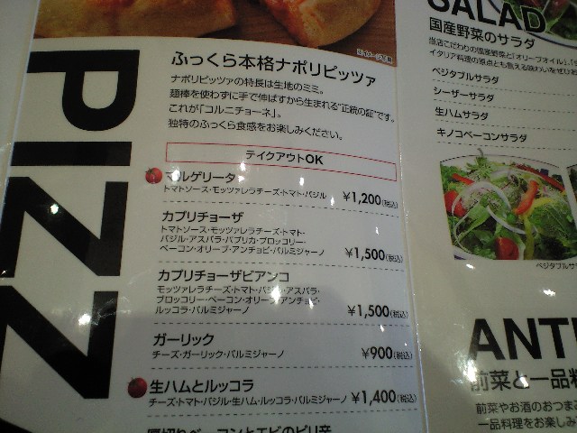メニューを眺めピザから1種類、パスタから1種類をチョイス。