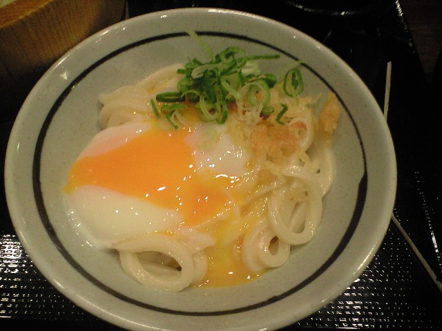 うどんにお汁を掛け、葱と揚げ玉を乗せ席に移動する。