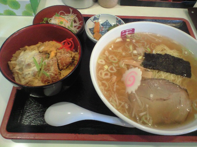 ラーメン、ミニかつ丼、サラダ、お新香。