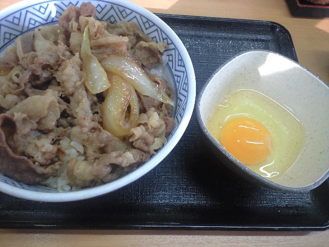 牛丼に七味をたっぷり振って、生卵を掛ける。