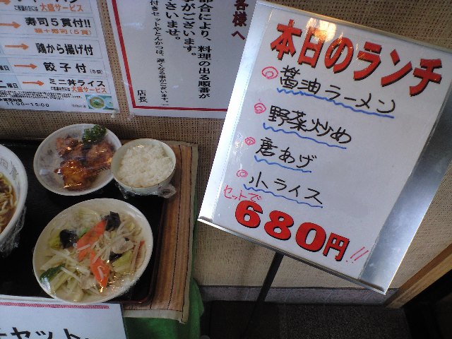 醤油ラーメン、ライス、野菜炒め。