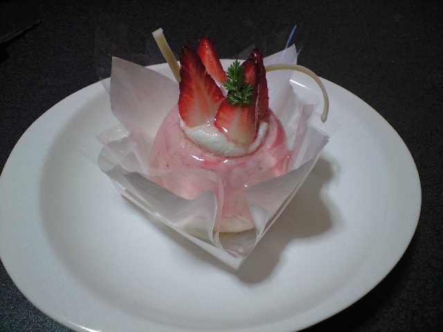 「いちごのババロア&ココナッツミルクのムースの中に、赤すぐりの実とラズベリーが入っています。」